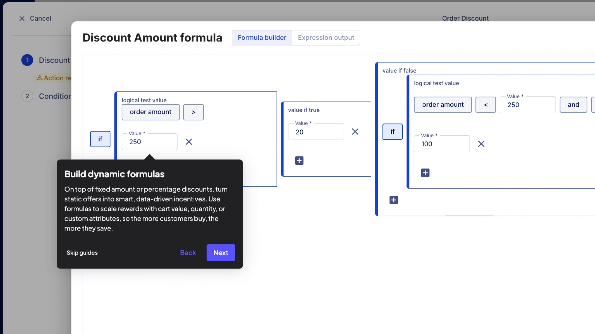 - Dynamic formulas: Adjust discount values based on redemption time, cart behavior, or customer data.