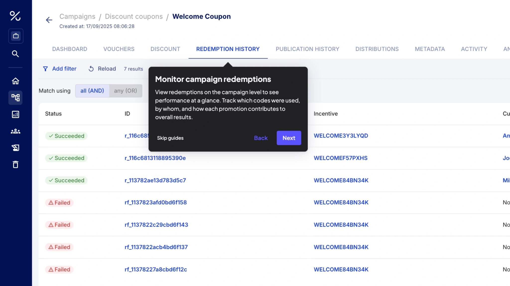 - Campaign-level redemption history: Access granular data on successful and failed redemptions.